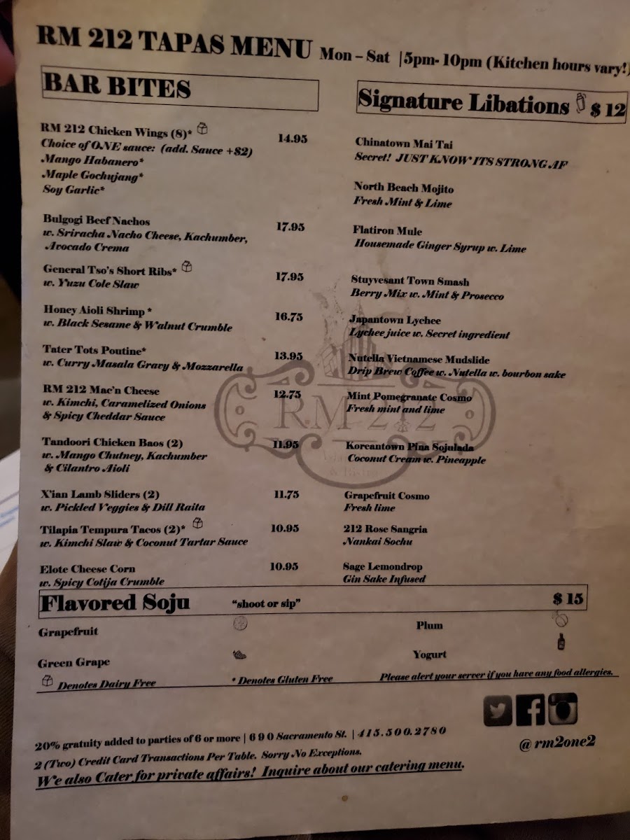 Introducing RM 212, a hidden gem nestled at 690 Sacramento St in San Francisco, where modern bar dining meets culinary creativity. This cozy speakeasy vibe makes it ideal for post-work drinks and delectable small plates rather than a full dinner experience. Guests rave about their flavorful offerings such as beef bulgogi nachos, crispy salt and pepper wings, and corn fritters that add an exciting twist to traditional bar food.